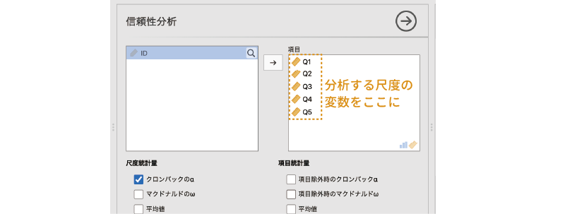 この画面で,内的一貫性の指標を算出したい質問の回答値が入った変数を指定します。通常は1つの尺度に含まれている質問すべてを指定しますが,その尺度が複数の下位尺度2から構成されている場合には,1つの下位尺度に含まれている質問のみを指定します。サンプルデータのメッセージアプリ志向尺度は「Q1」から「Q5」までの5つの質問で構成されていますので,これら5つを「項目」の領域に移動します(図 10.5)。