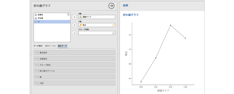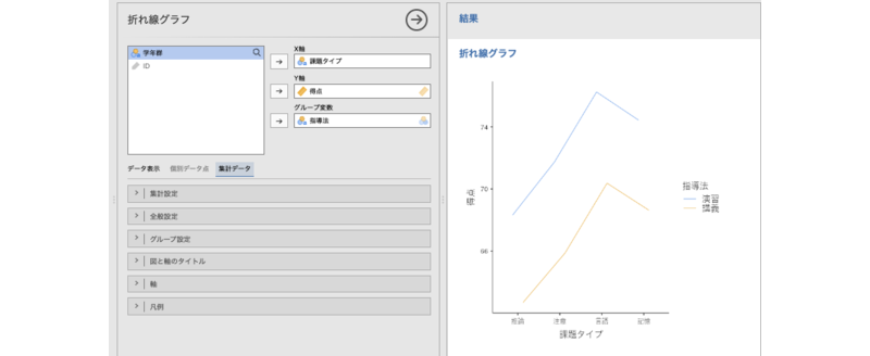 このデータは,課題タイプごとの得点を,指導法と学年群の2種類のグループで測定したデータです(架空データ)。折れ線グラフの「集計値」表示を使うと,このような個票データから平均値などの集計値を自動算出して図示できます。実際のデータ分析では,こちらの機能を使うことが多いでしょう。