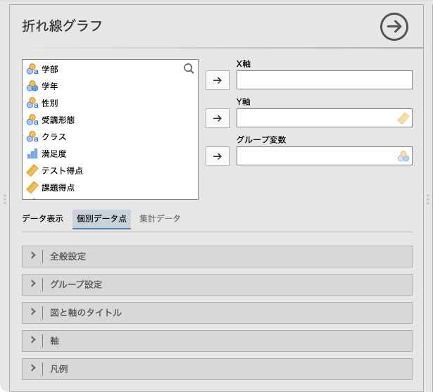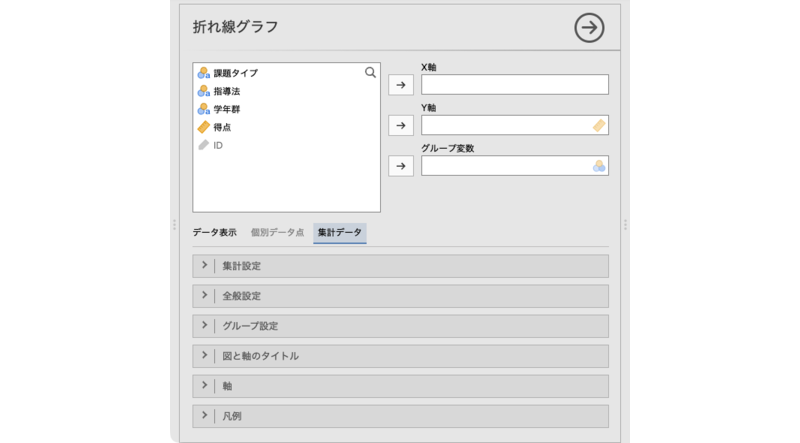「X軸」と「グループ変数」はどちらも名義尺度や順序尺度の離散型の変数ですが,それぞれX軸に表示されるか,凡例に表示されるかが異なるので,内容に応じて適切に選択しましょう。たとえば,名義尺度変数と順序尺度変数がある場合には,順序尺度変数をX軸にしたほうが,変化が視覚的に捉えやすくなります。