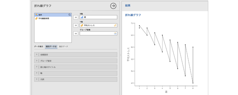 これは,マインドフルネスのセッションを行った群とそうでない群の,週ごとのストレス値,および睡眠時間の平均値のデータです。集計済みデータの折れ線グラフ作成機能は,このような時系列データの視覚化に適しています。